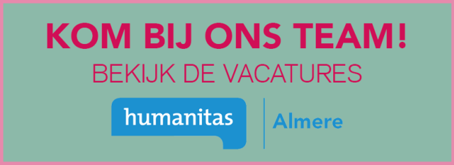 Humanitas is een landelijke vrijwilligersorganisatie met een grote Almeerse afdeling. Samen met ruim 700 vrijwilligers ondersteunen we stadsgenoten van 0 tot 100 jaar. Mensen die tijdelijk wat hulp kunnen gebruiken. We doen dat met meer dan 20 programma's in de thema’s: opvoeden, opgroeien, verlies, eenzaamheid, geldzaken, taal, detentie, levensboek, scheiding en nieuw in Almere.