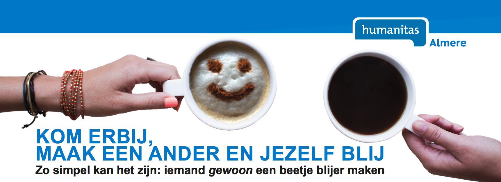 Een kopje koffie drinken. De tijd nemen voor iemand die eenzaam is, rouwt of in de gevangenis zit. Of daar net uit komt. Ouders ondersteunen die vastlopen in de opvoeding. Een dagje samen met een kind erop uit. Een paar uur per week een mede-Almeerder helpen bij de Nederlandse taal of het op orde brengen van geldzaken. Samen met iemand een levensboek maken of helpen bij het vinden van een goeie omgangsregeling.
